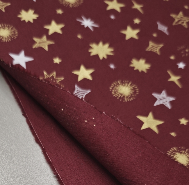 Dieser festliche Popeline in edlem Bordeaux mit goldenen Sternen zaubert sofort weihnachtliche Stimmung in vsak projekt. Der Stoff fühlt sich angenehm an, lässt sich leicht verarbeiten und ist ideal für festliche Hemden, Kinderkleider, Röcke, Accessoires für Weihnachtsfotos sowie leichte Wohn-Deko wie Kissenhüllen, Tischdetails oder kreative Geschenkideen.