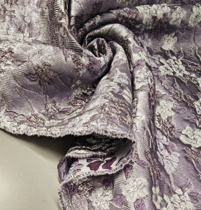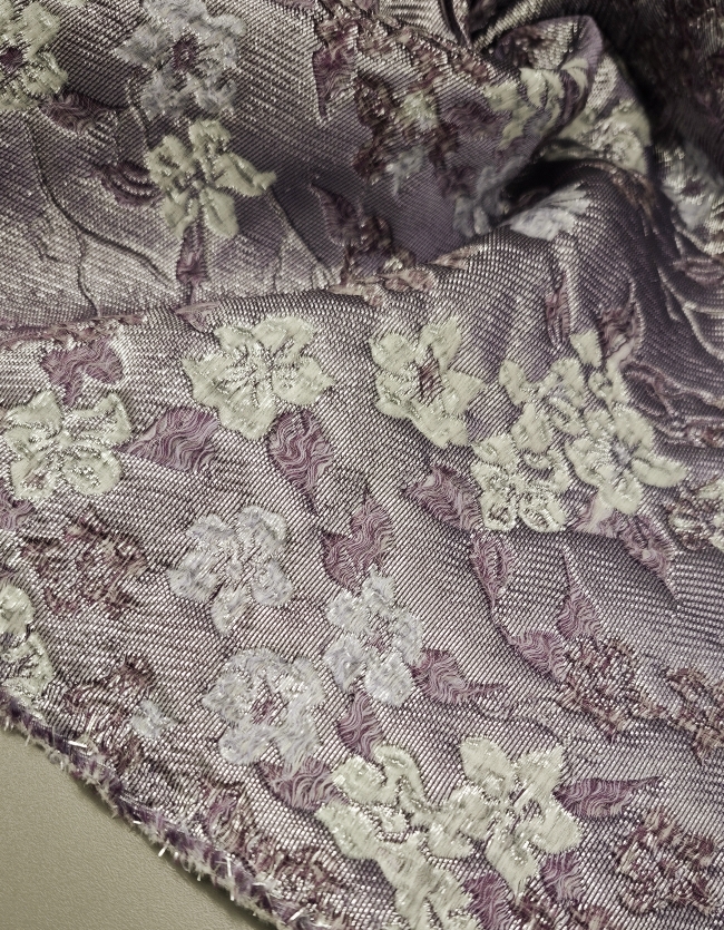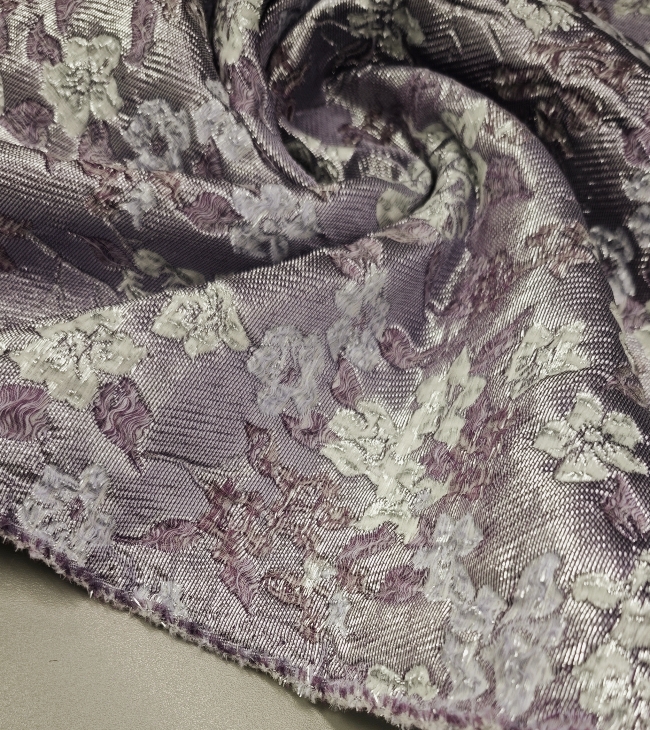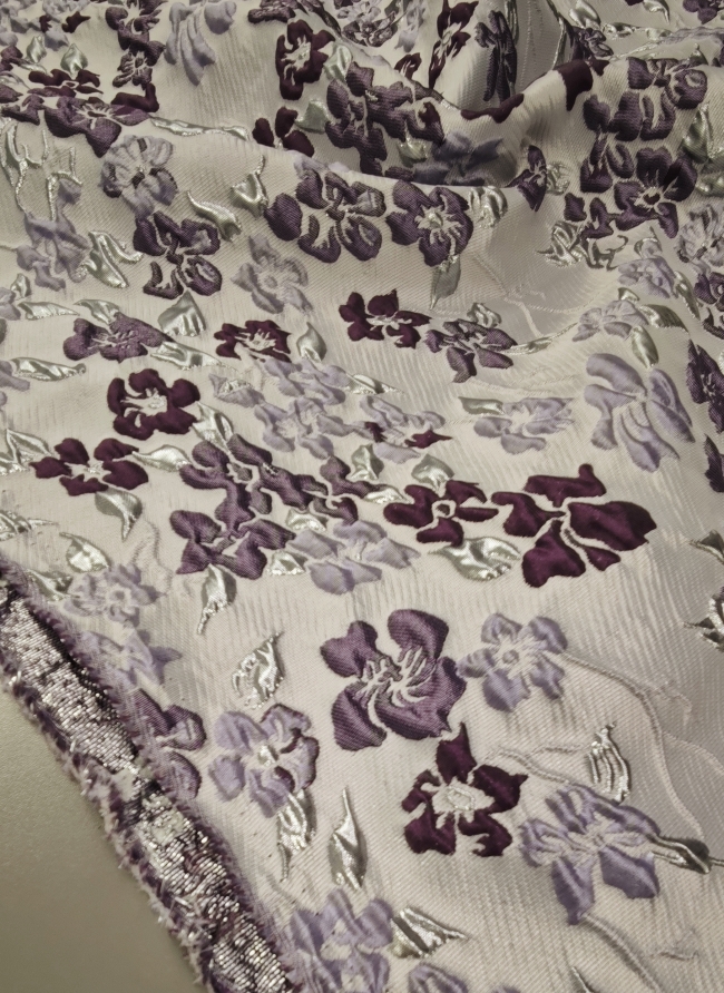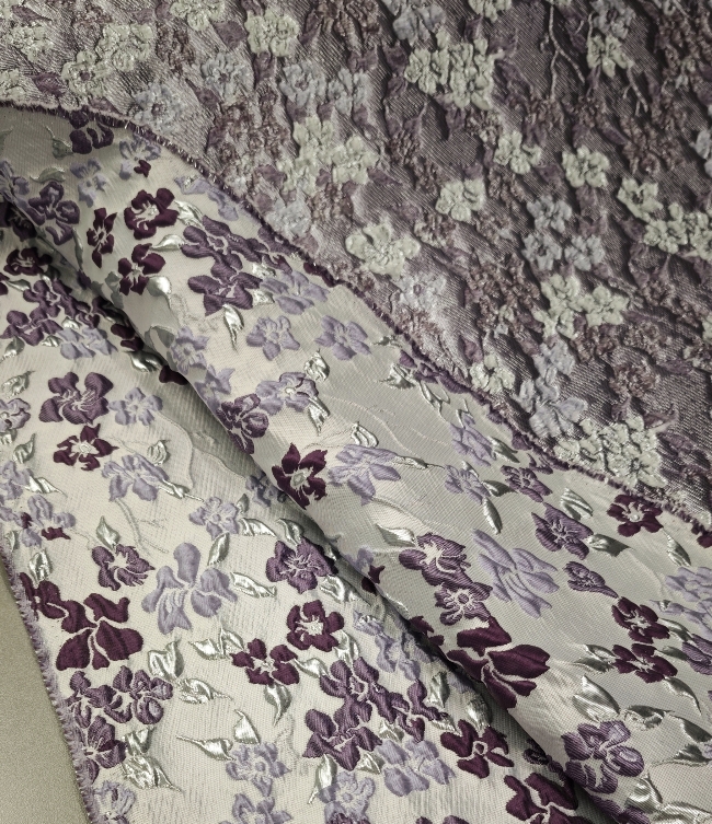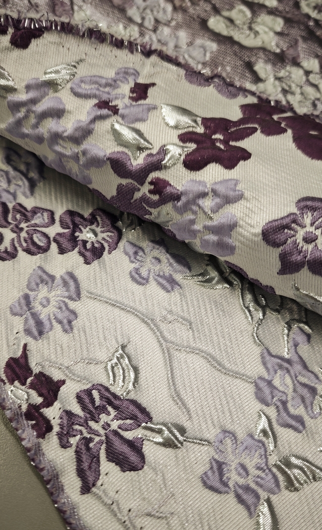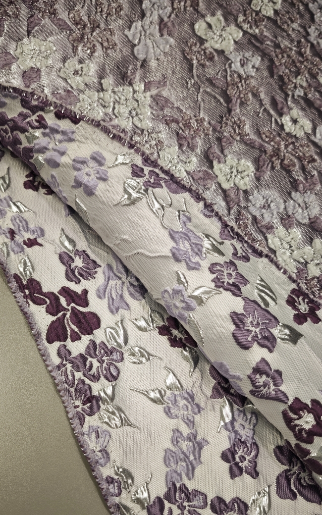 Dieser beidseitige Jacquard in Silber-Violett begeistert mit seinem edlen Glanz und seiner luxuriösen Optik. Dank der beidseitigen Struktur kannst du aus einem Stoffstück zwei verschiedene Looks kreieren – perfekt für kreative und stilvolle Designs.