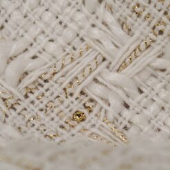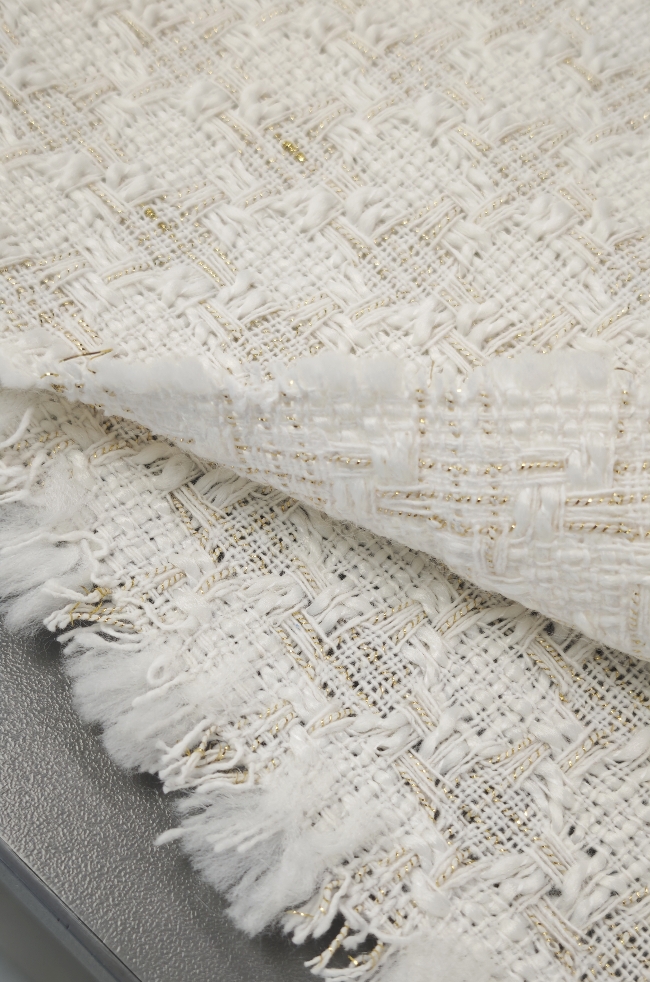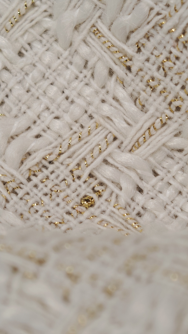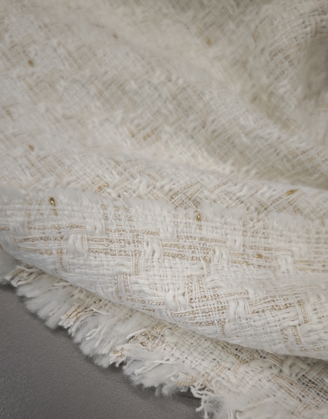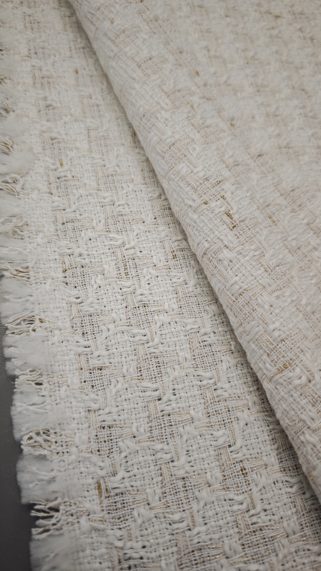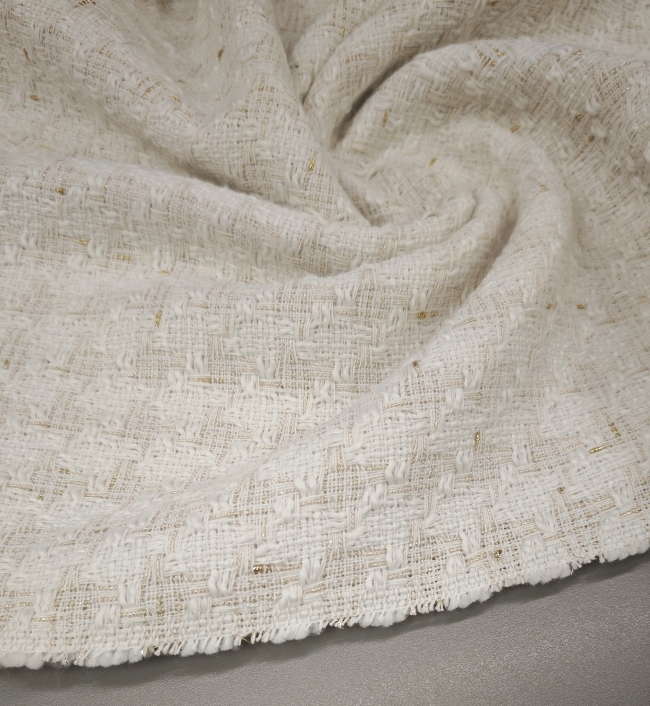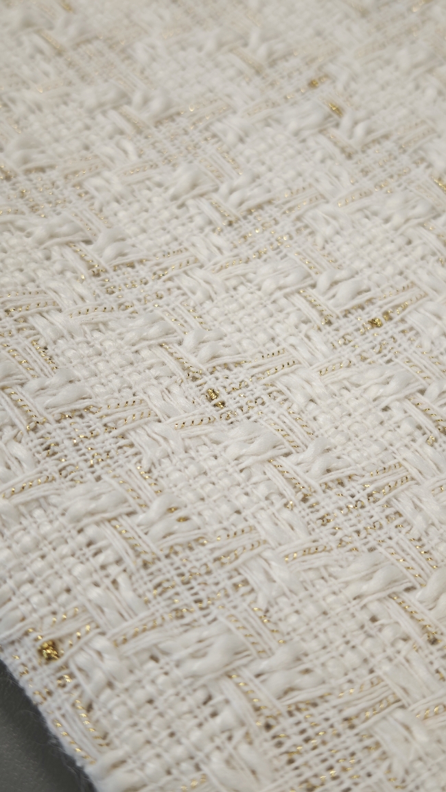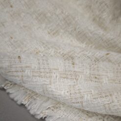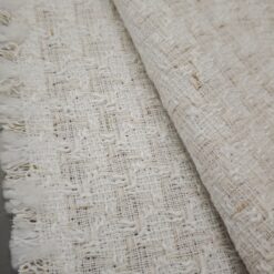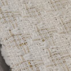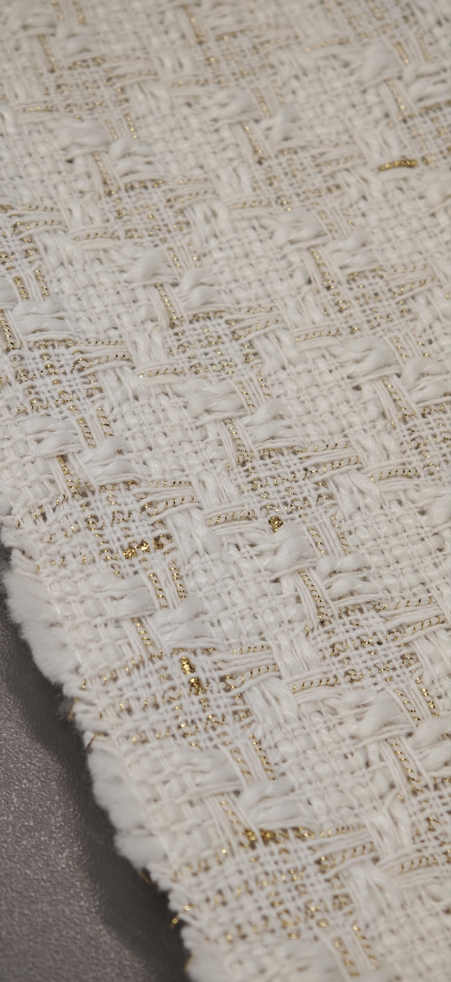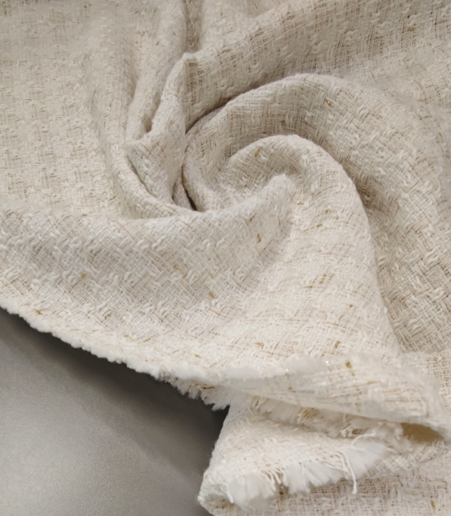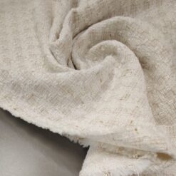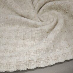 🌟 Bouclé-Stoff in Farbton Milchkaffee mit goldenen Fäden – elegante Baumwolle