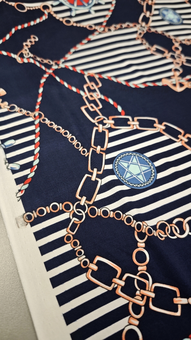 Elastische dunkelblaue Lycra mit maritimem Ketten- und Ankermotiv. Glatte, weiche Oberfläche mit gutem Stretch und klarem Fall. Geeignet für Kleider, Shirts, Röcke, Leggings sowie Bade- und Strandbekleidung. Formstabil, angenehm zu tragen und vielseitig verwendbar.