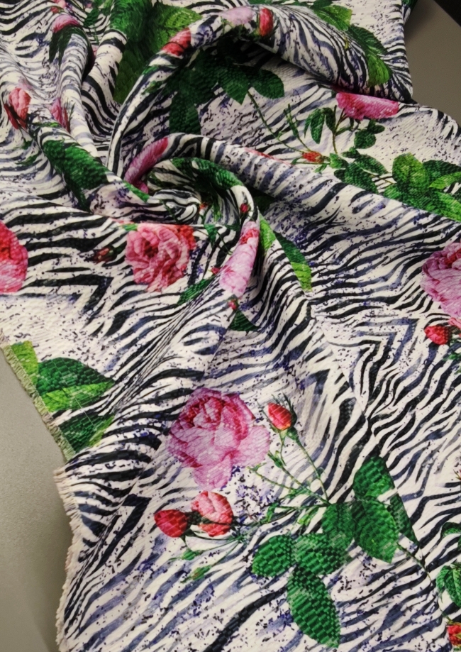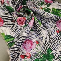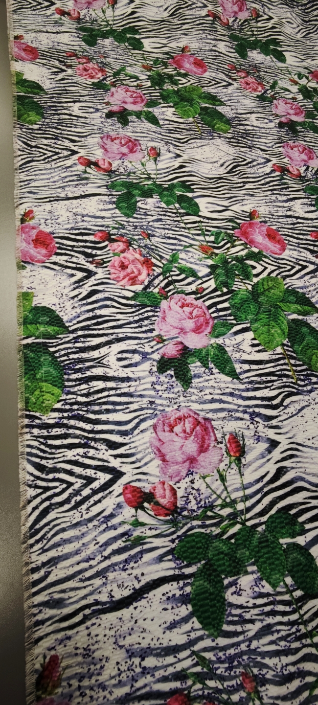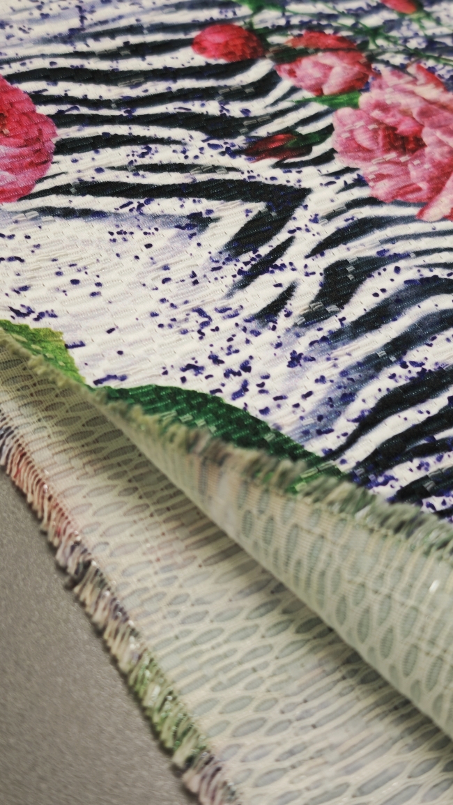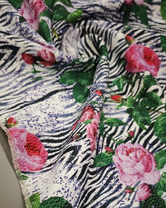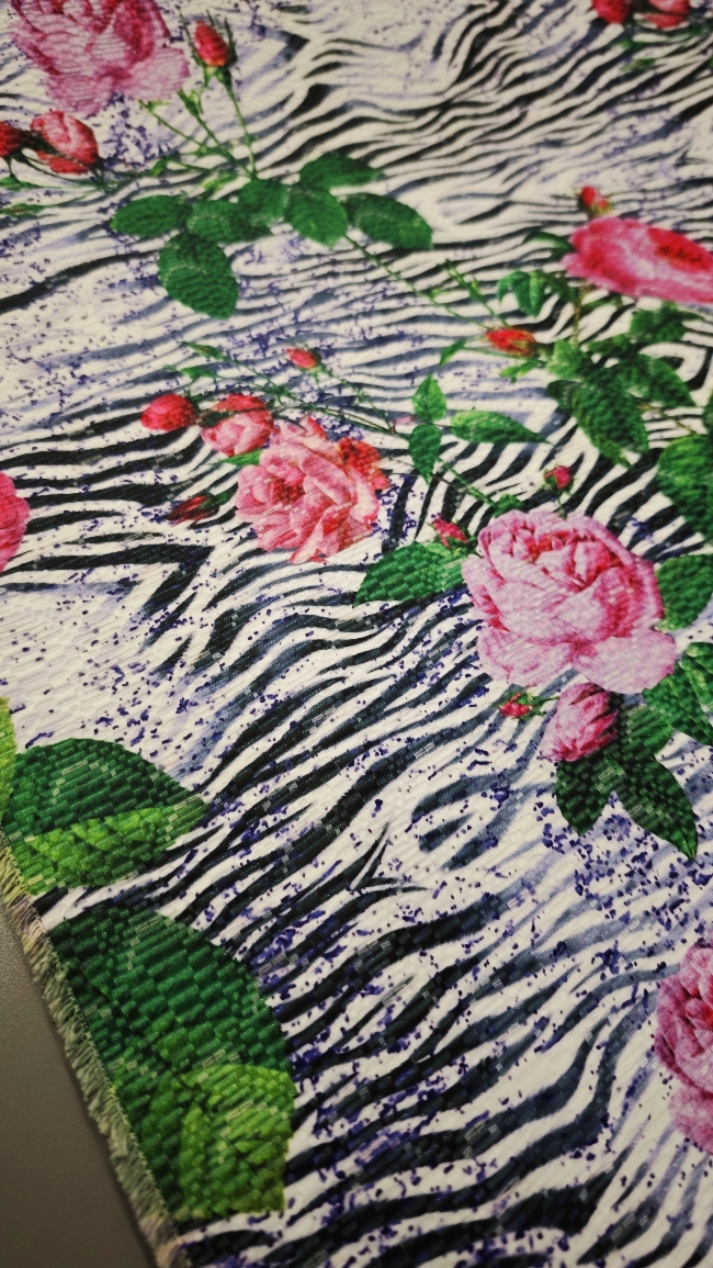 Dieser exklusive Jacquard vereint das Beste aus zwei Welten – die zeitlose Eleganz von Rosenmotiven und den wilden Charakter des Zebra-Musters. Das Ergebnis ist ein auffälliger Stoff mit außergewöhnlichem Stil, der sofort ins Auge fällt.