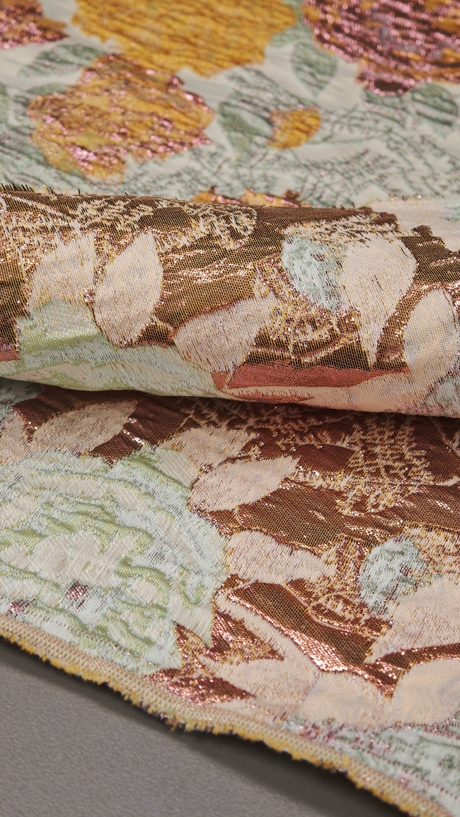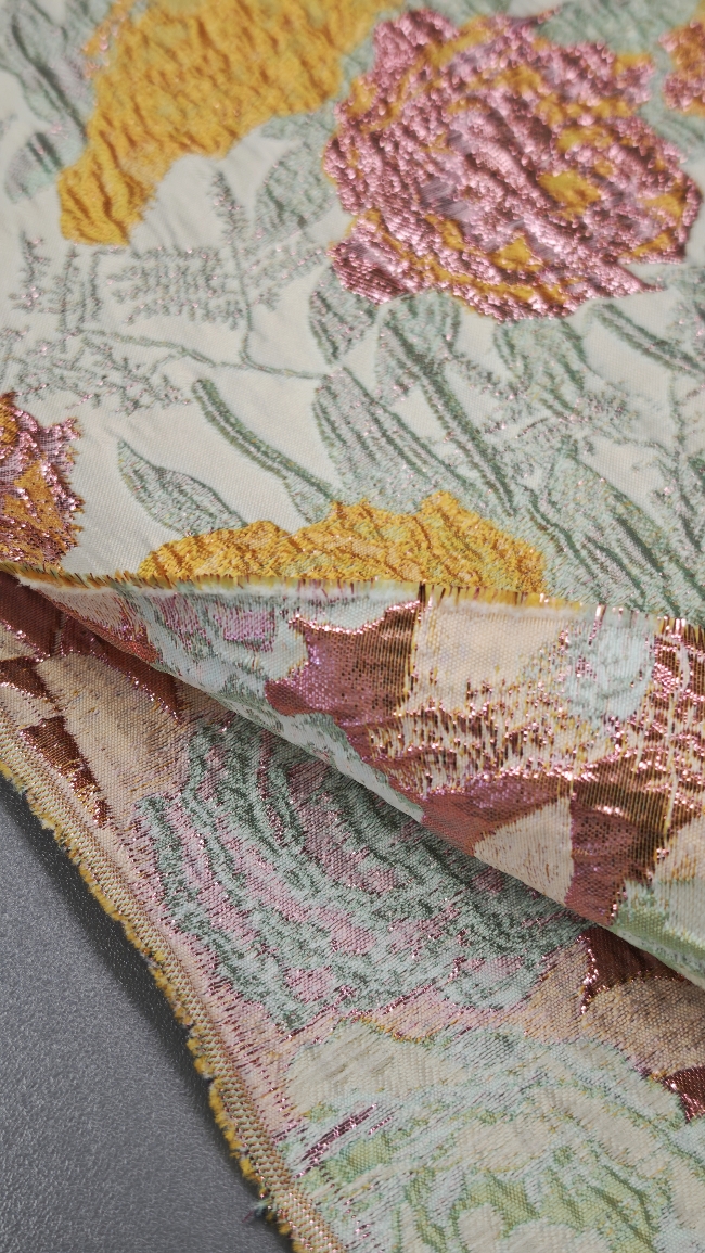 Dieser luxuriöse, beidseitige Jacquardstoff besticht durch sein edles Design mit goldgelben und rosé-kupferfarbenen Rosen, die durch den 3D-Effekt lebendig zur Geltung kommen. Das feine, leicht strukturierte Gewebe wirkt elegant und hochwertig, ideal für alle, die Stil und Qualität schätzen.
