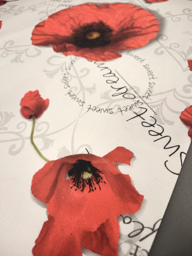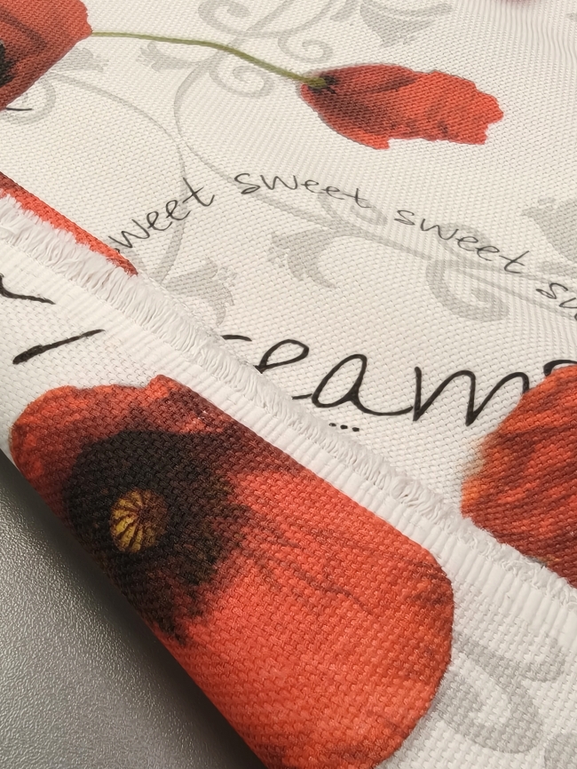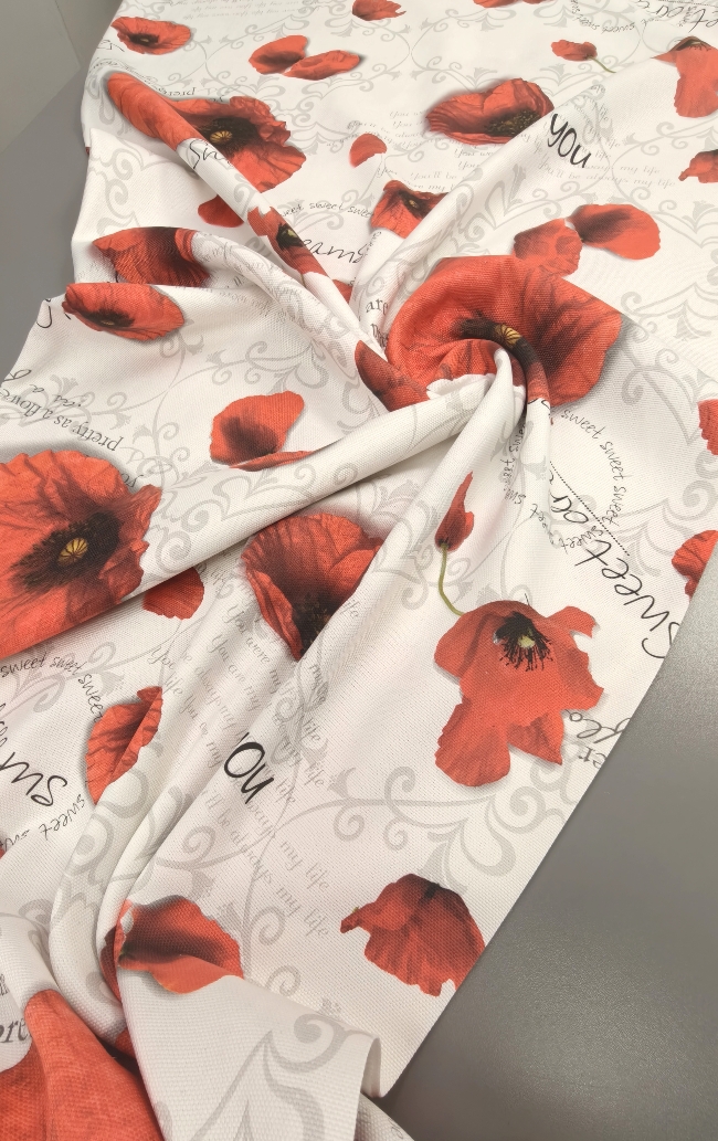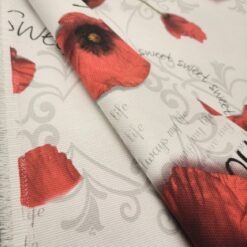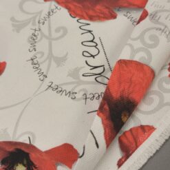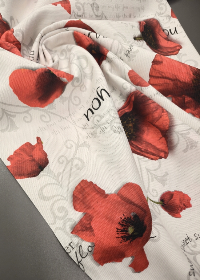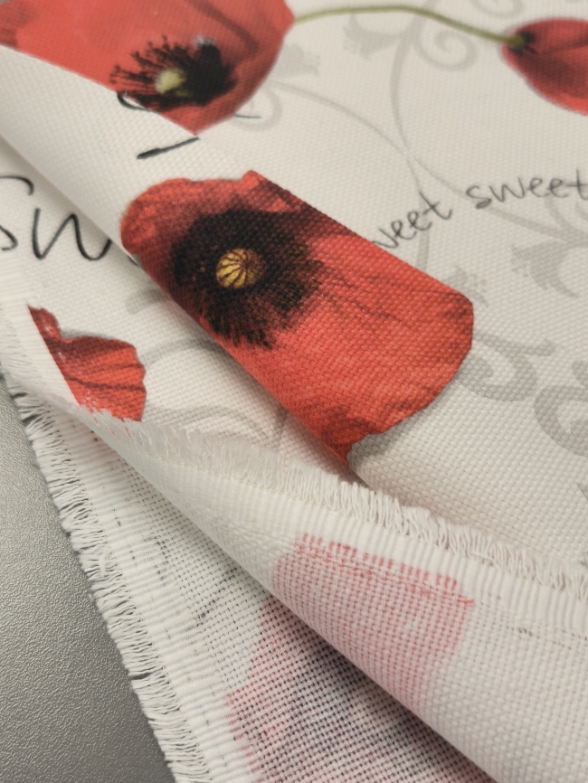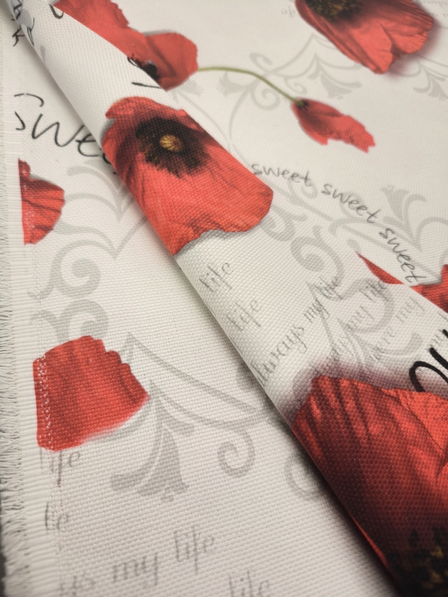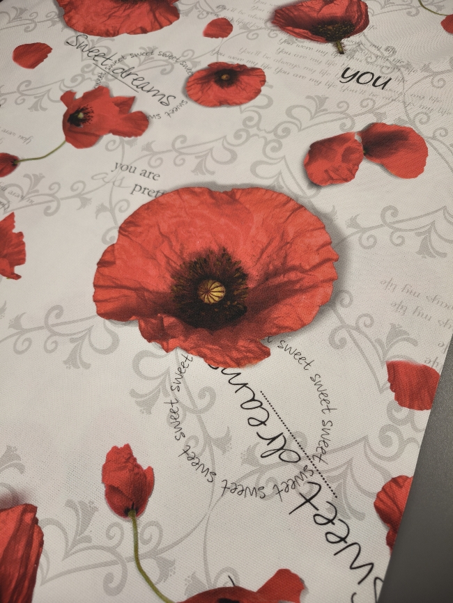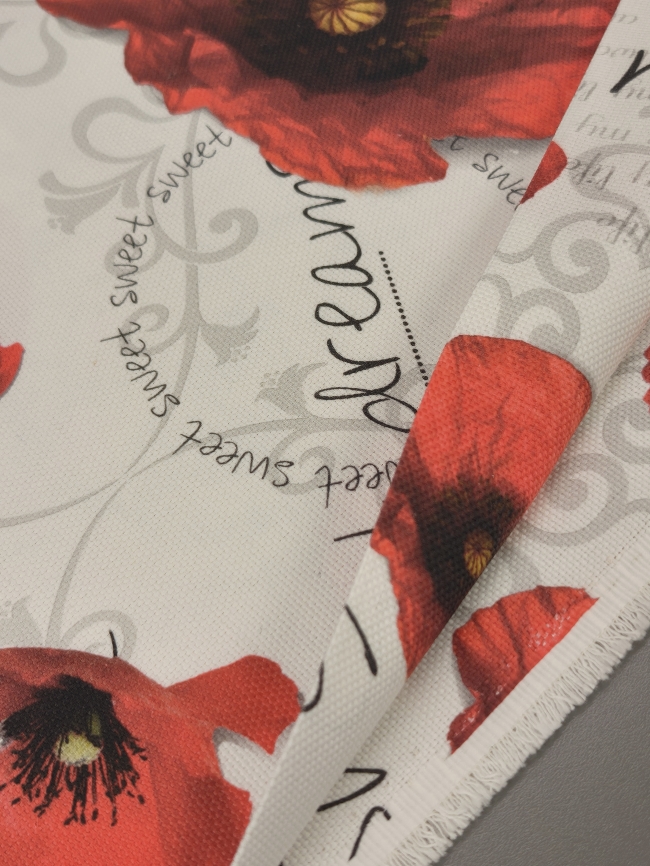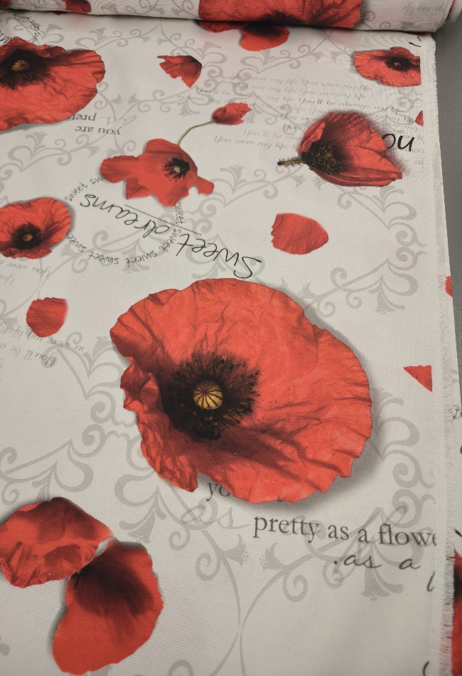 Verleihen Sie Ihrem Zuhause eine liebevolle Note mit diesem prachtvollen Dekostoff im floralen Design. Die detailreich gestalteten Mohnblüten und sanften Schriftzüge schaffen eine stimmungsvolle Atmosphäre – perfekt für Vorhänge, Kissen, Tischdecken oder kreative DIY-Projekte.