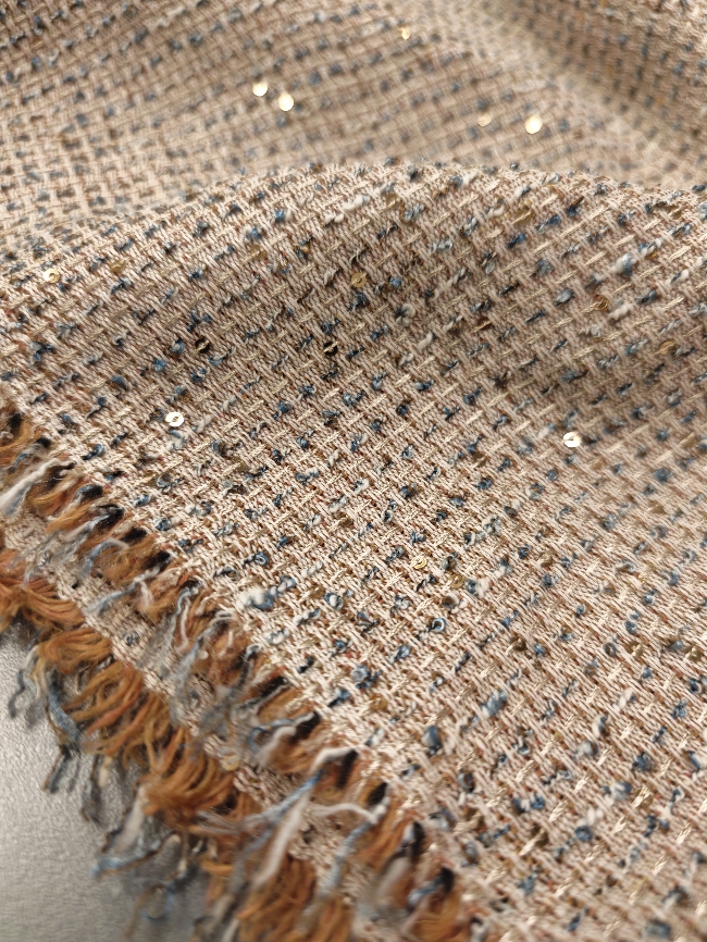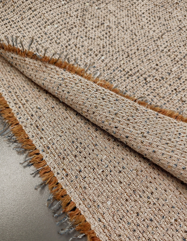 Hochwertiger Bouclé-Stoff in Altrosa mit typischer, leicht strukturierter Oberfläche aus kleinen Schlingen und eingearbeiteten Pailletten, die dem Material einen dezenten Glanz verleihen. Der Stoff wirkt lebendig, modisch und elegant.