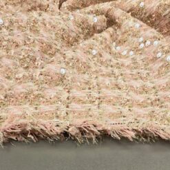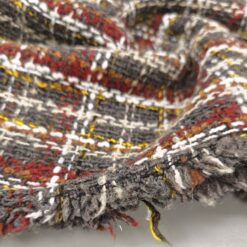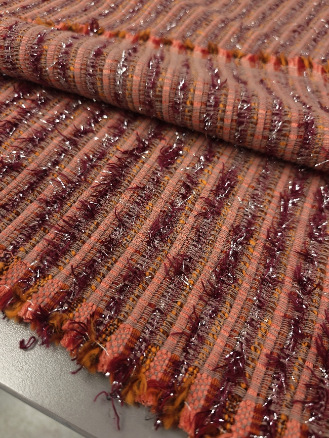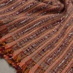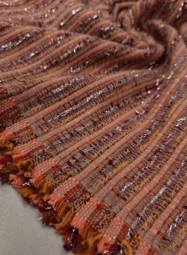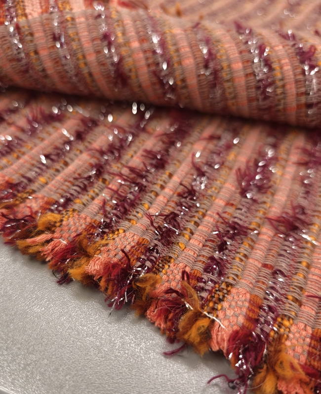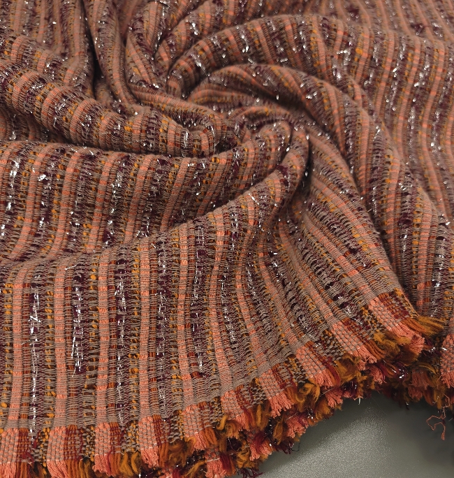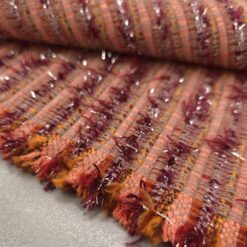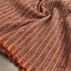 Hochwertiger Bouclé Stoff in warmem Terakotta-Ton mit dezenten silbernen Effektfäden. Die strukturierte Oberfläche verleiht dem Stoff eine edle Optik im beliebten Chanel-Stil und sorgt für einen modernen, modischen Charakter.