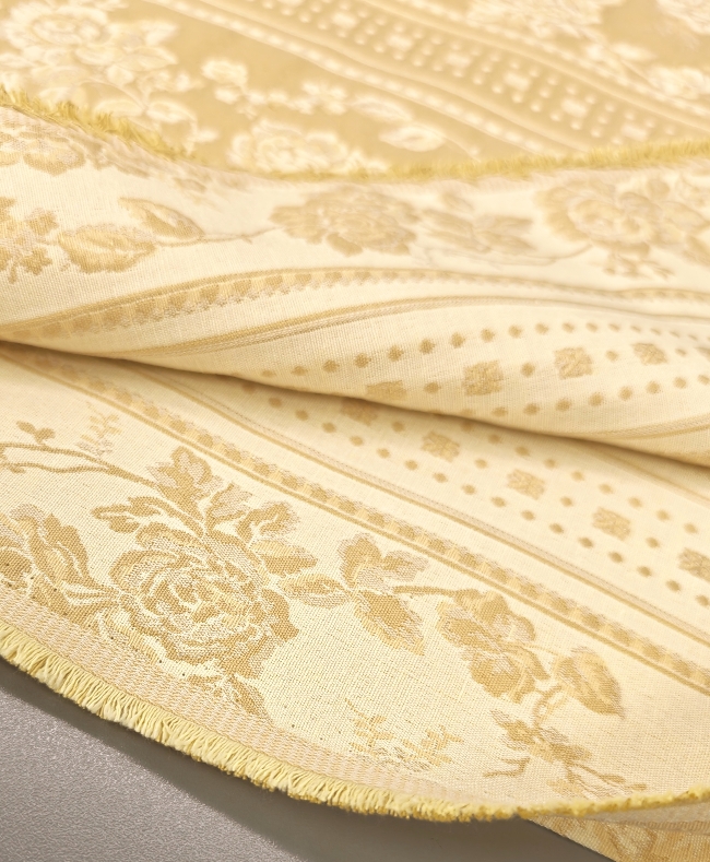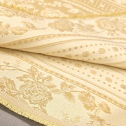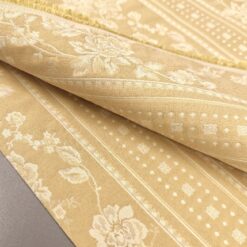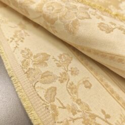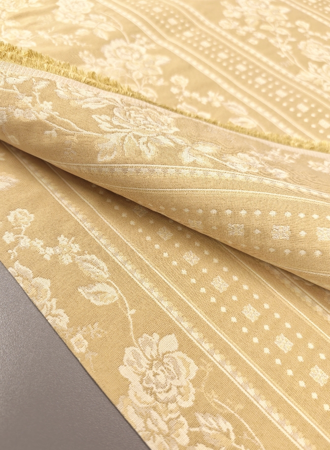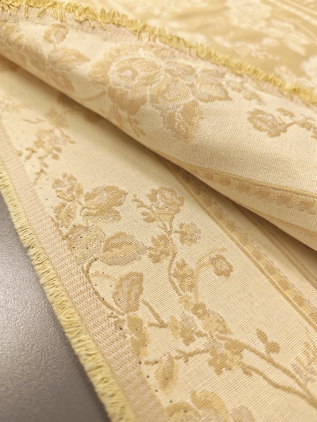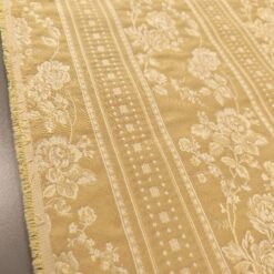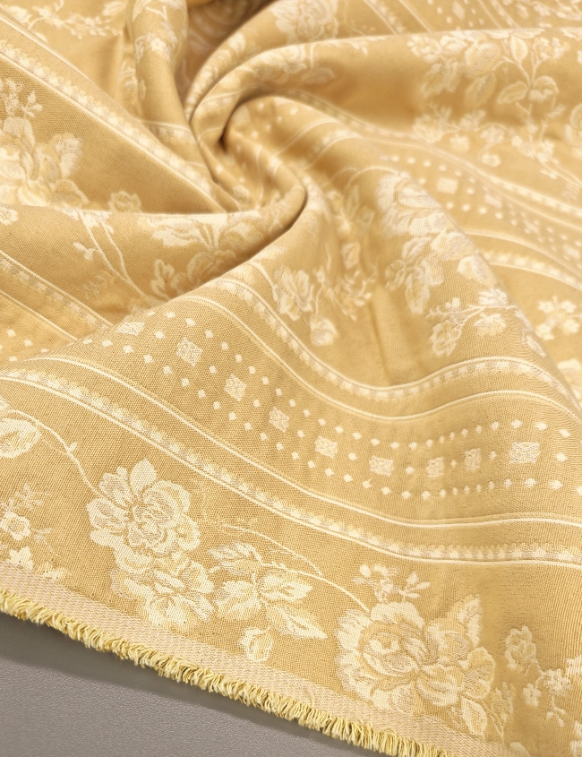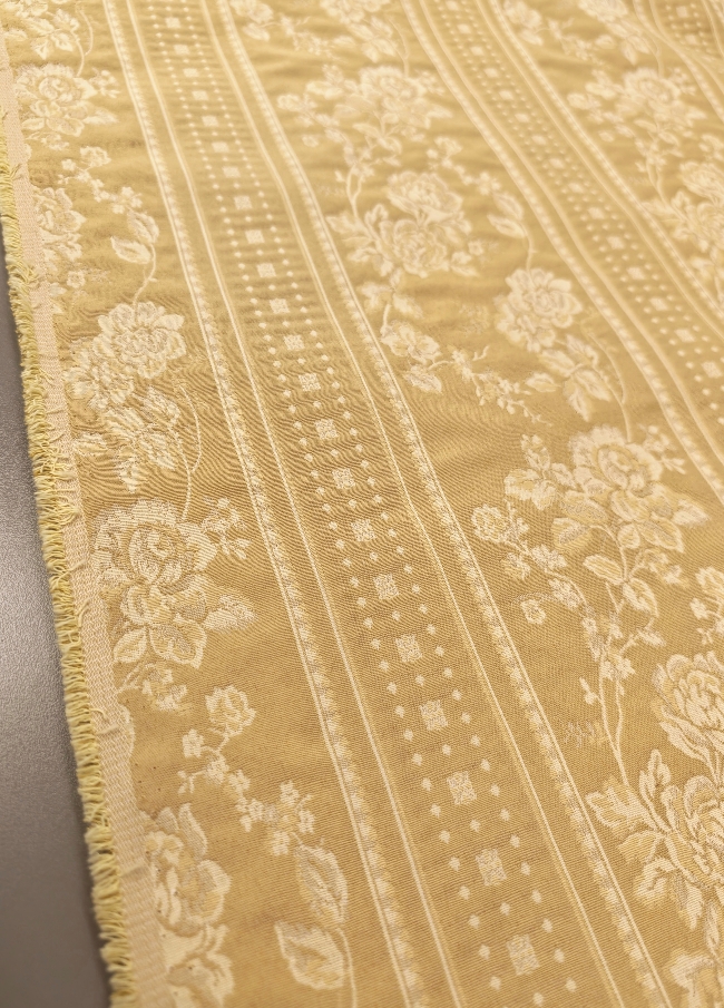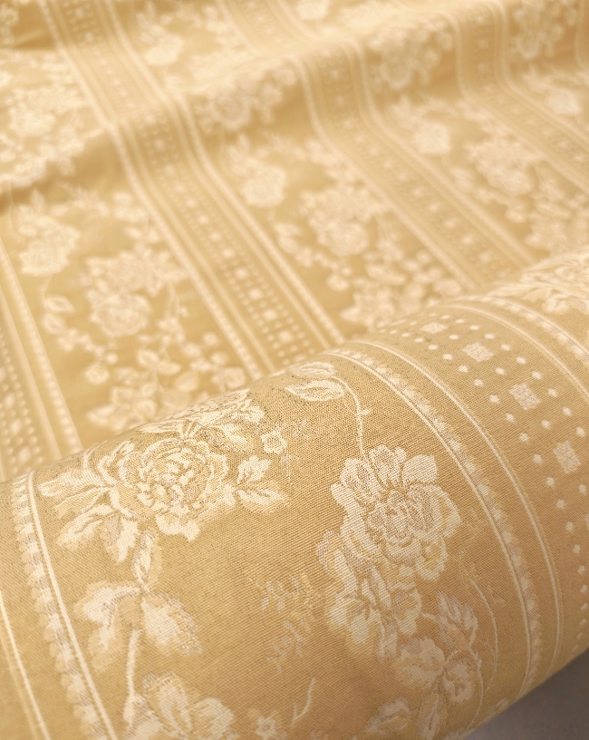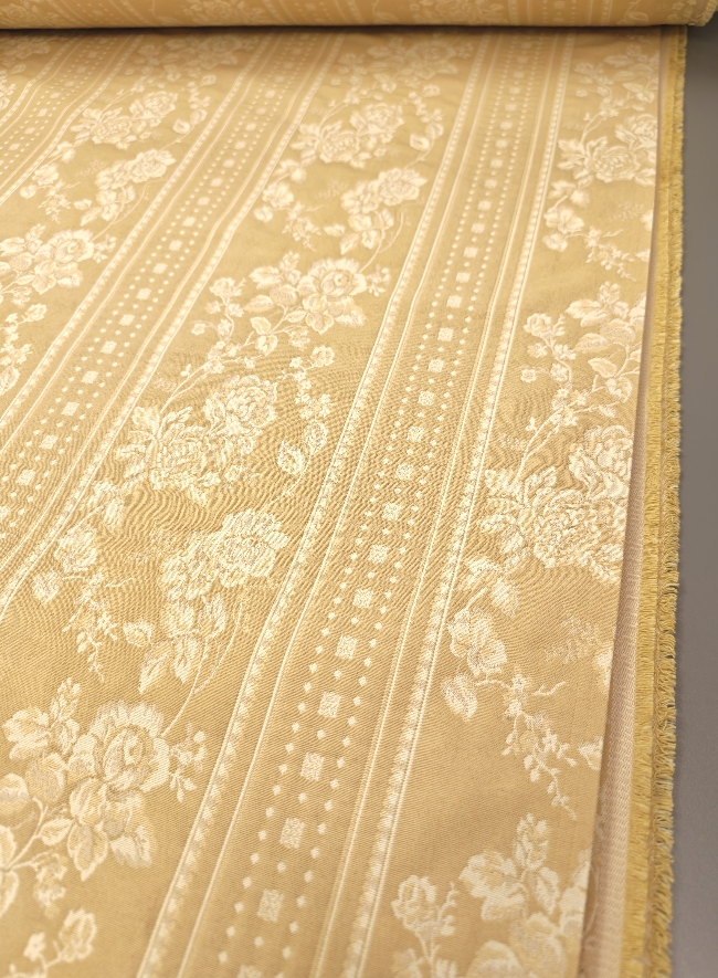 Eleganter, dichter Jacquard-Dekostoff in Gold mit barockem Blumenmuster. Beidseitig verwendbar, mit klarer Struktur und dekorativer Optik. Ideal für Vorhänge, Tischdecken, Überwürfe und klassische Wohnraumgestaltung.