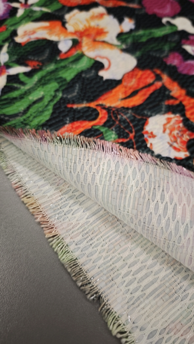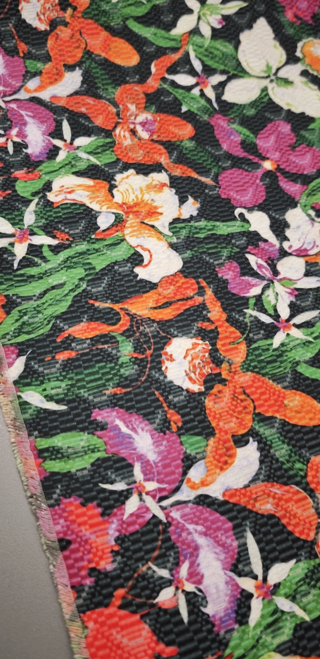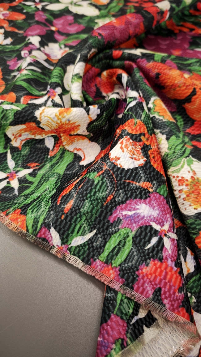 Kraftvoller Blumenjacquard mit intensivem, mehrfarbigem Muster auf tiefschwarzem Grund. Die klare, kontrastreiche Optik wirkt hochwertig und präsent, das Jacquardgewebe zeigt eine dichte, strukturierte Oberfläche mit sehr guter Formstabilität.