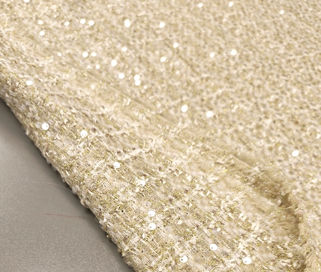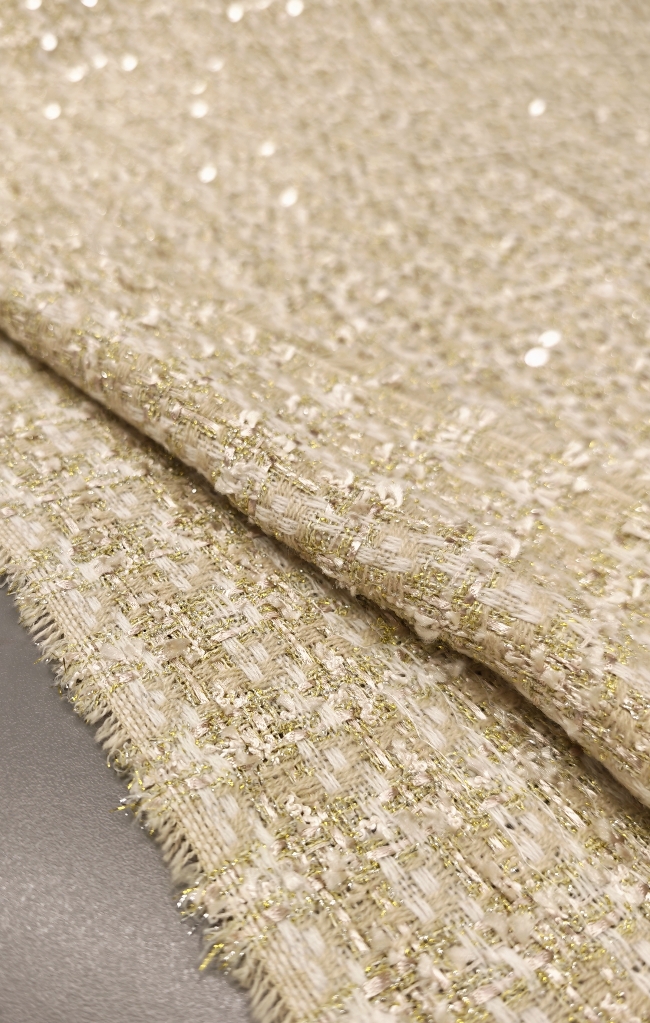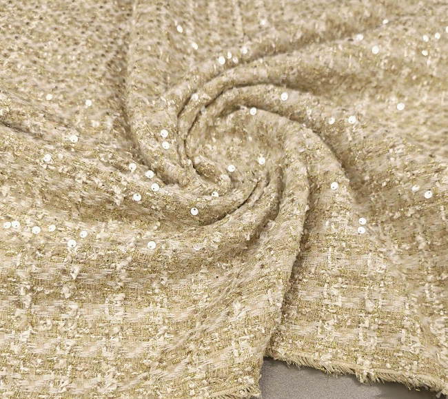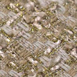 Edler Bouclé Stoff in gold-grüner Farbnuance mit dezent eingearbeiteten Pailletten. Die typische Bouclé-Struktur sorgt für eine lebendige, leicht strukturierte Oberfläche und einen hochwertigen Look. Ideal für elegante Kostüme, Jacken, Blazer, Mäntel und modische Röcke. Ein auffälliger Stoff mit besonderer Optik, perfekt für stilvolle Kleidungsstücke.