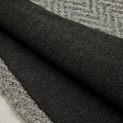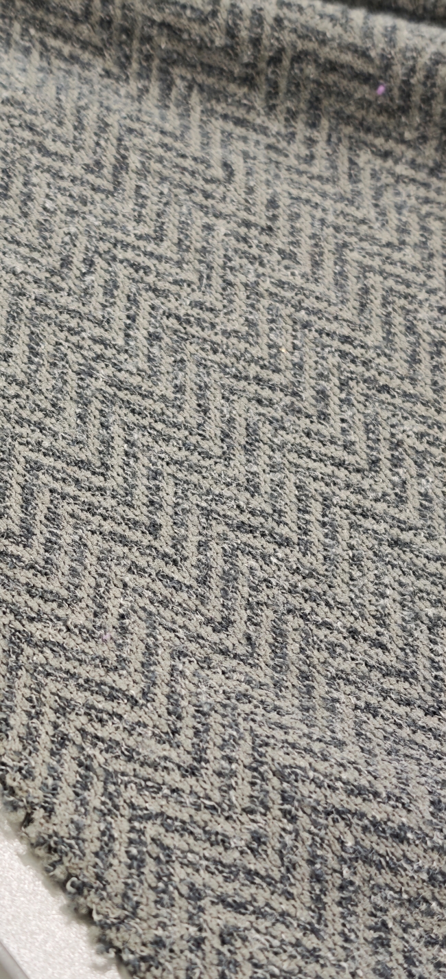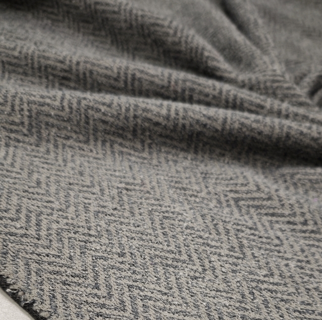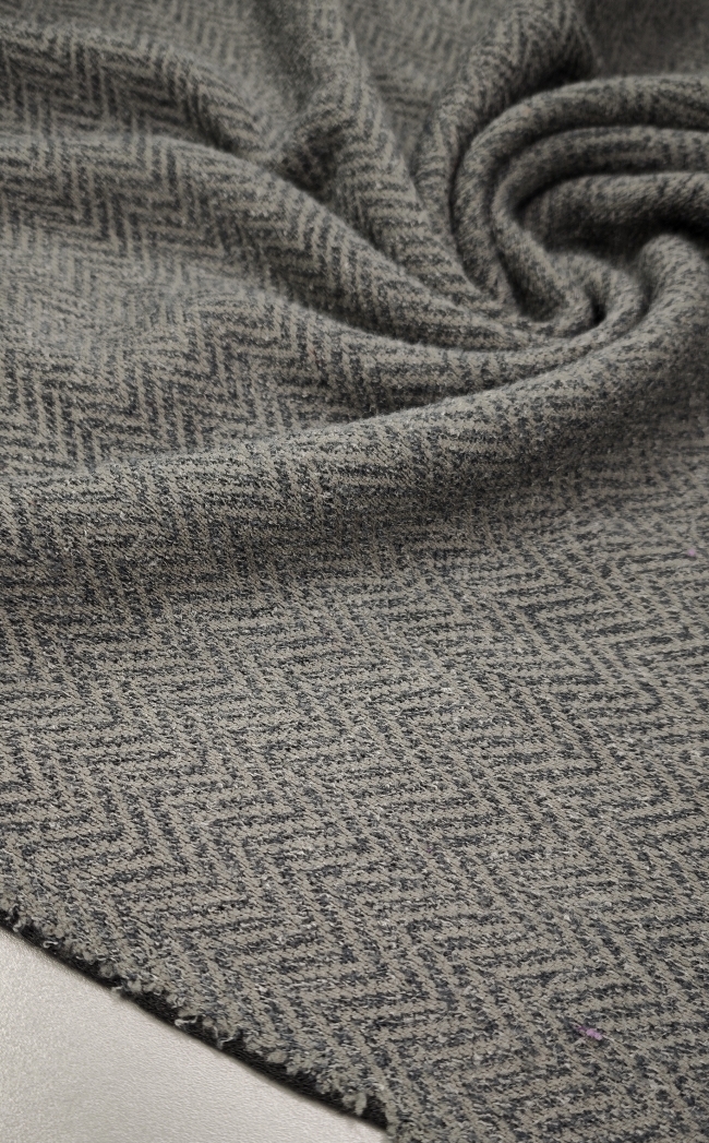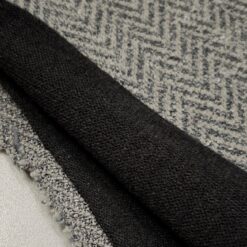 Elastische graue Strickware mit klar erkennbarem Fischgrätmuster und weichem Griff. Der Stoff ist angenehm dehnbar, fällt locker und sorgt für hohen Tragekomfort. Die strukturierte Oberfläche wirkt ordentlich und zeitlos, ohne steif zu sein.