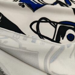 Dieser Jersey mit außergewöhnlichem Muster in Blau und Schwarz zieht sofort die Blicke auf sich. Die stilisierten Taschen verleihen dem Stoff eine moderne und zugleich verspielte Note, ideal für alle, die einzigartige Kleidungsstücke kreieren möchten.