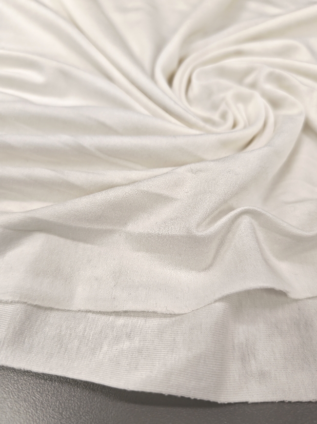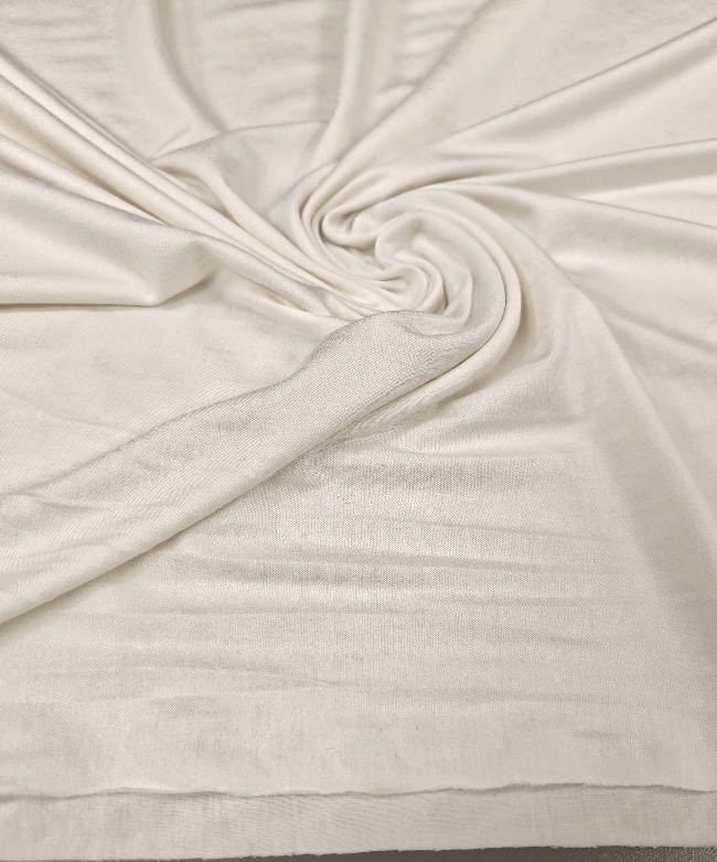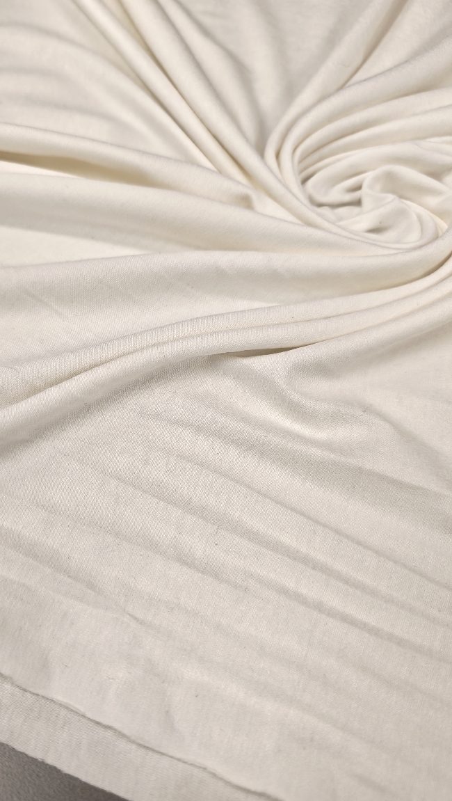 Elastischer Baumwolljersey in milchweißer Farbe. Angenehm weich, hautfreundlich und durch den Elasthananteil flexibel. Ideal für T-Shirts, Kleider, Röcke, Leggings, Kinderkleidung und bequeme Freizeitkleidung.