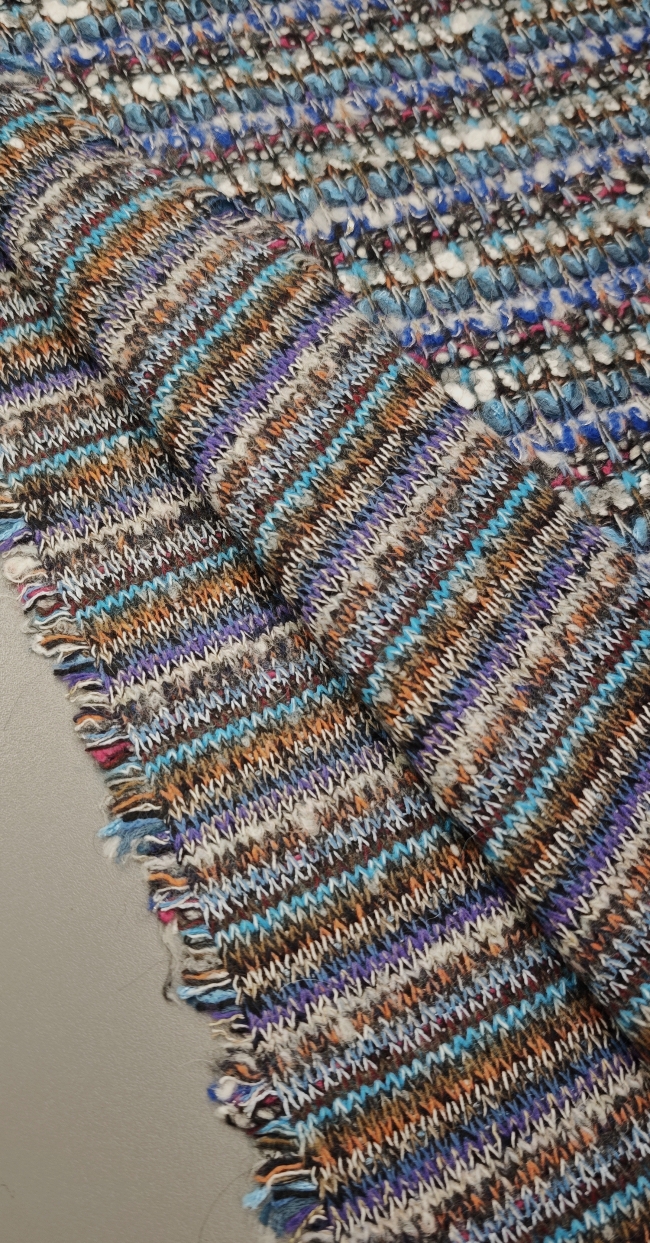 Diese außergewöhnliche Strickware im ikonischen Missoni-Stil begeistert mit ihrem farbenfrohen Streifenmuster und der edlen Haptik. Die hochwertige Wollmischung sorgt für Wärme, Komfort und ein luxuriöses Tragegefühl – ideal für exklusive Modeprojekte.